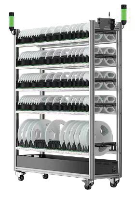 B型智能(neng)料架為標(biao)準13寸料盤(pan)存儲(chu)料架,單(dan)面存放(fang),500個儲(chu)位,單(dan)色(se),多色(se)可選,最(zui)大可支(zhi)持7色(se)