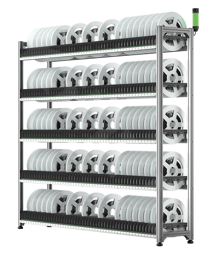 A型智(zhi)能料(liao)(liao)(liao)架為(wei)標準(zhun)7寸料(liao)(liao)(liao)盤存儲(chu)料(liao)(liao)(liao)架,雙(shuang)面存放,1400個(ge)儲(chu)位,單色(se),多(duo)色(se)可選,最大(da)可支持7色(se)